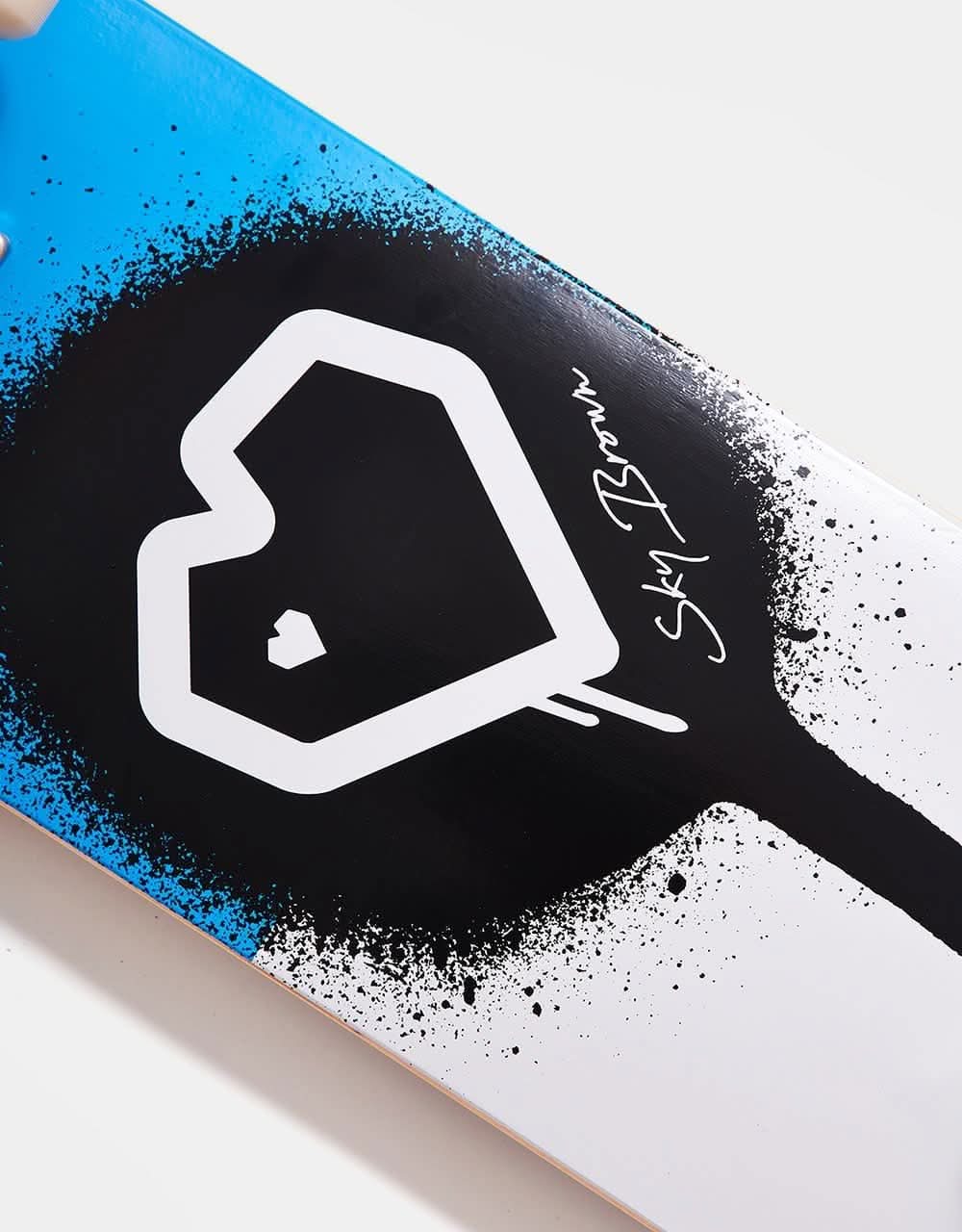 Coming in at 8” wide, the deck features Blueprint’s iconic spray heart graphic, with a blue upper half and white lower half background. On the tail sits Blueprint and MLSL branding and Sky’s name sits near the centre of the deck. The board comes equipped with raw Blueprint branded trucks, 52mm 99a wheels and Abec 7 bearing, making it the ideal board for those just starting out or wanting an upgrade on their current setup.