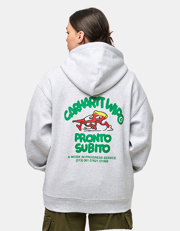 A brand that needs no introduction - presenting the Carhartt WIP Pronto Hooded Sweatshirt Jacket in Ash Heather. This stylish Carhartt WIP sweatshirt is composed of a cotton blend, styled in a relaxed fit, and features screen printed Carhartt WIP graphics on the front chest and back. Perfect for everyday fits and pairs well with baggy jeans, this skate sweatshirt is a must-have for any casual wardrobe.