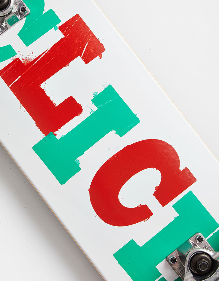 The Cliché Woodcut Complete Skateboard comes fully set up and ready to skate. The deck features some classic Cliché branding in red and teal on a white background and comes in a 8" wide, fully equipped with Tensor Raw Trucks and 52mm Cliché wheels, making it the ideal set up for those who are just starting out.