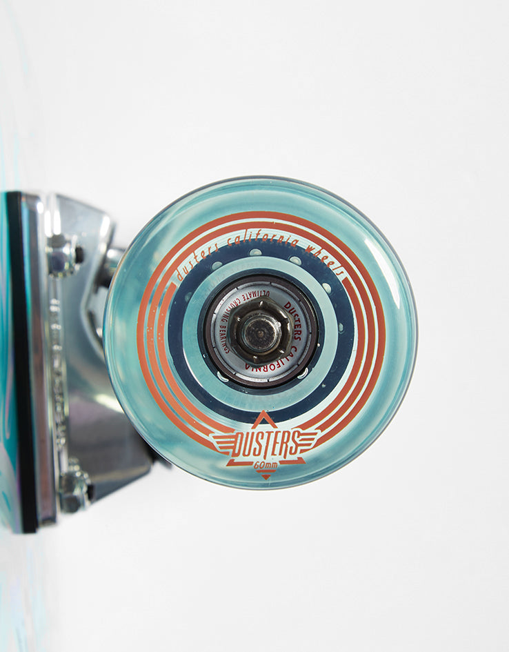 The Prism cruiser from Dusters features a California-themed graphic with Dusters branding featured on the tail. This board features Tensor Trucks, Dusters Wheels and ABEC 7 Bearings.