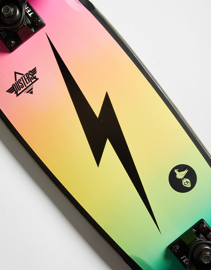 Ride the lightning with the Bird Fade Cruiser Skateboard by Dusters, a small, smooth, and nimble board that's all about the journey. It has a clean and classic lightning bolt design, and is finished with Tensor trucks and soft 59mm Dusters wheels for a speedy ride even on rougher surfaces.