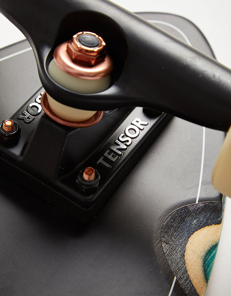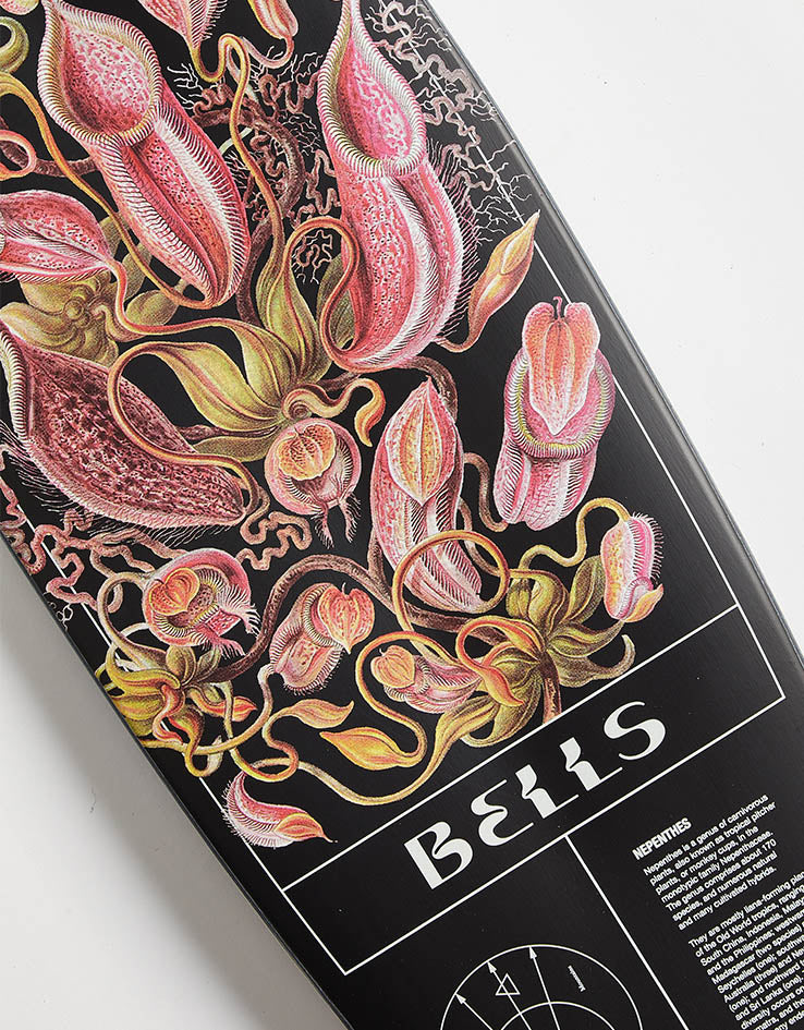 The Globe Bells Pitcher Longboard is a long wheelbase tapered longboard which is fully set up and ready to hit the streets. Coming in at 8.5" wide, the deck features a scientific drawing of a plant atop a black background. It comes equipped with 6" Tensor Alloys, 65mm 78a SoftSlider wheels, Abec 7 bearings and printed black grip.