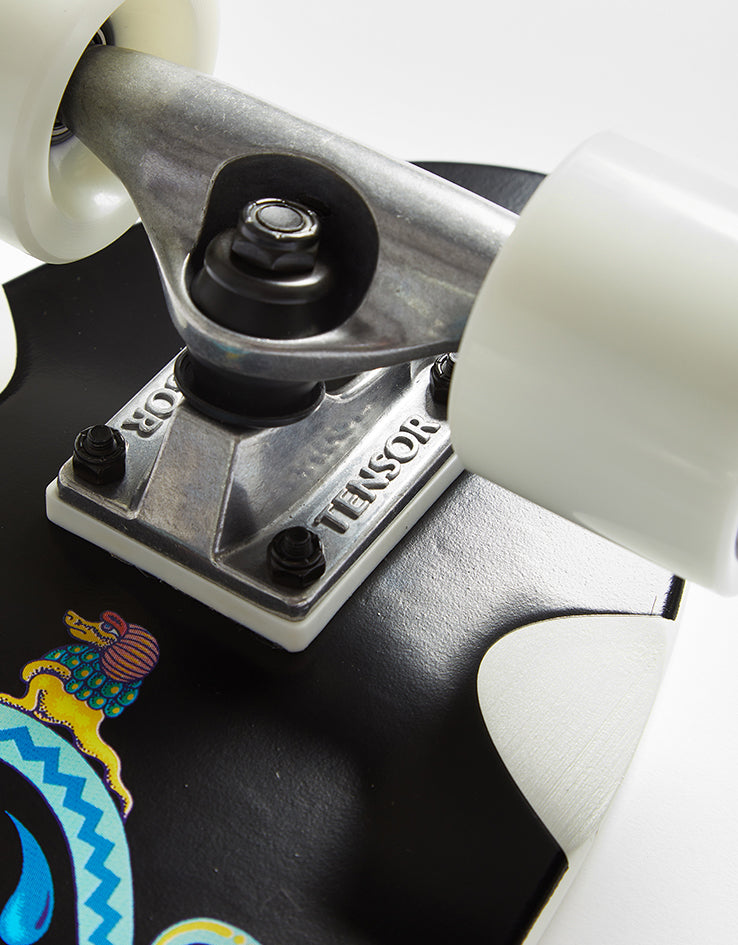The Globe Blazer Ma'at Cruiser Skateboard is a mini diamond-tail cruiser with soft conical wheels that comes fully set up and ready to hit the streets. Coming in at 7.25" wide the deck features art by Karl Grandin a collection of symbols down the length on the deck on a black background. It comes equipped with 4.25" Tensor alloy trucks, GITD 62mm 78a Conical Cruiser Wheels, Abec 7 bearings and Die-cut griptape.