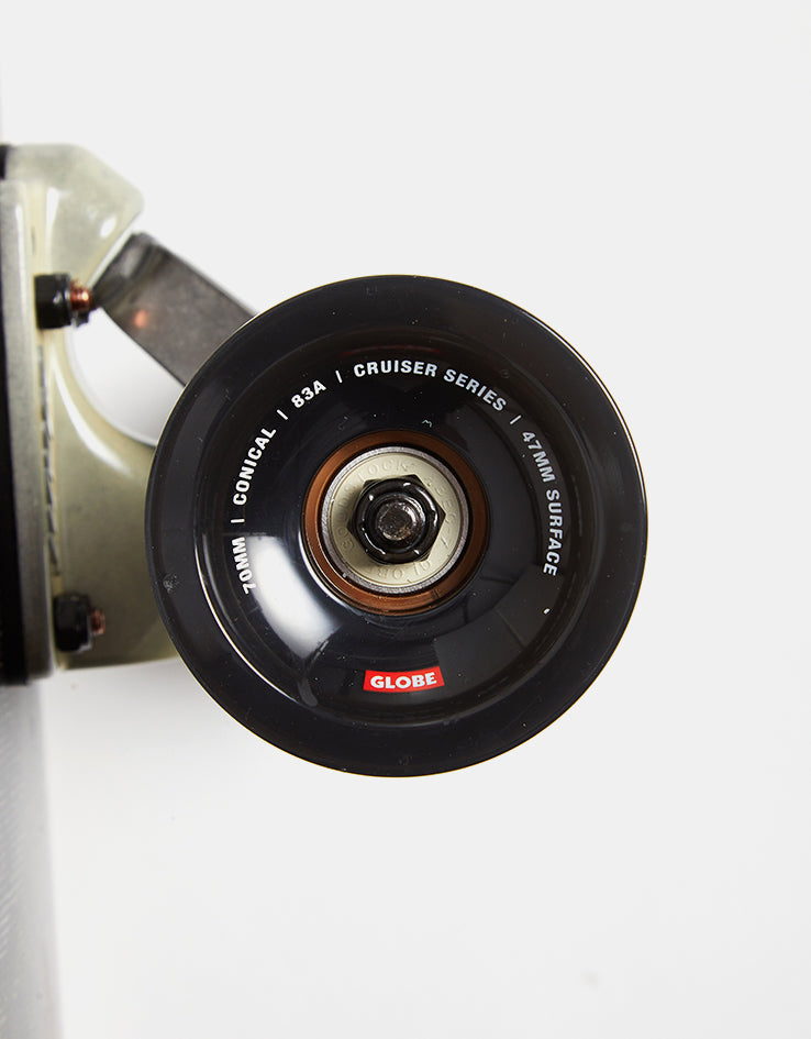 The Globe Byron Bay Nightshade Kicktail Longboard is a surf inspired squash tail longboard which is fully set up and ready to hit the streets. Coming in at 9.5" wide, the deck features an ebony wood design with a fabric inlay. It comes equipped with 150mm Slant reverse kingpin trucks, 70mm 78a Conical Cruiser wheels, Abec 7 bearings and clear broadcast grip.