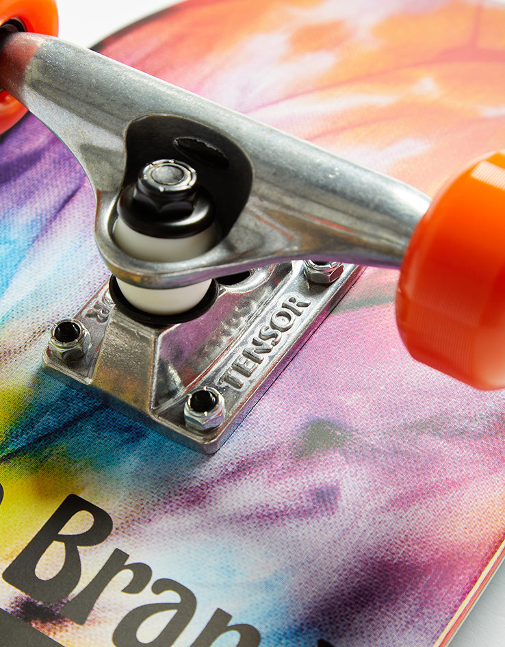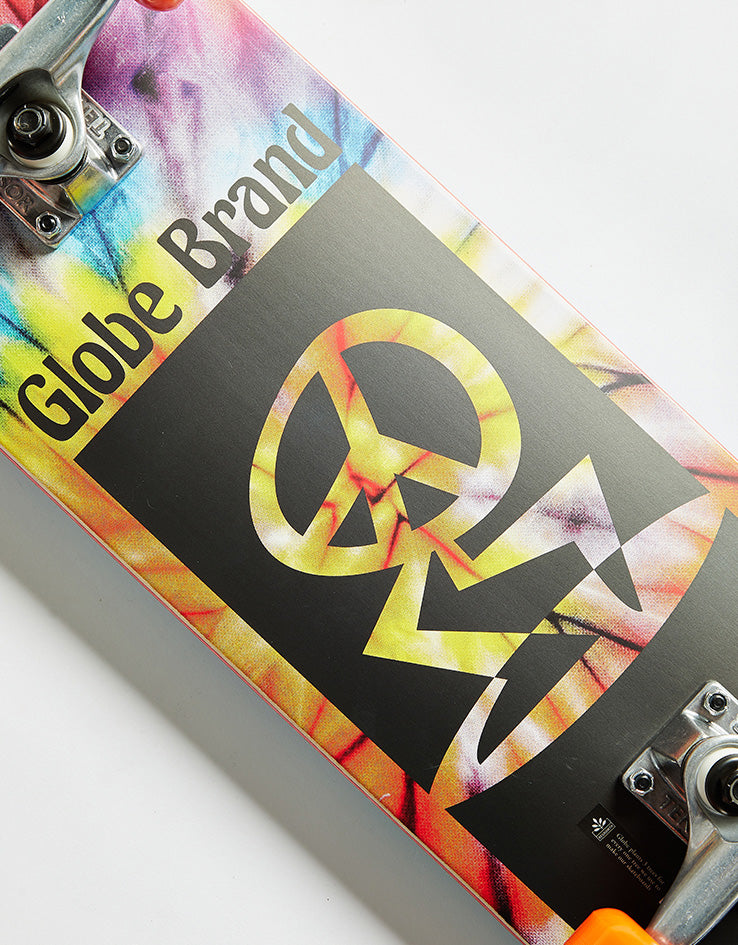 The Globe Kids Peace Man Mid Complete Skateboard comes fully set up and ready to hit the streets. The midsize deck has a graphic which features a dancing peace symbol on a tie dye background and comes in at 7.6" wide. It comes equipped with 5" Tensor alloy trucks, 51mm 95a wheels with soft, easy turning bushings, and Abec 7 bearings, making it the ideal board for those just starting out or wanting an upgrade on their current setup.