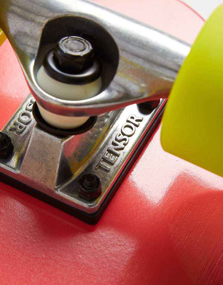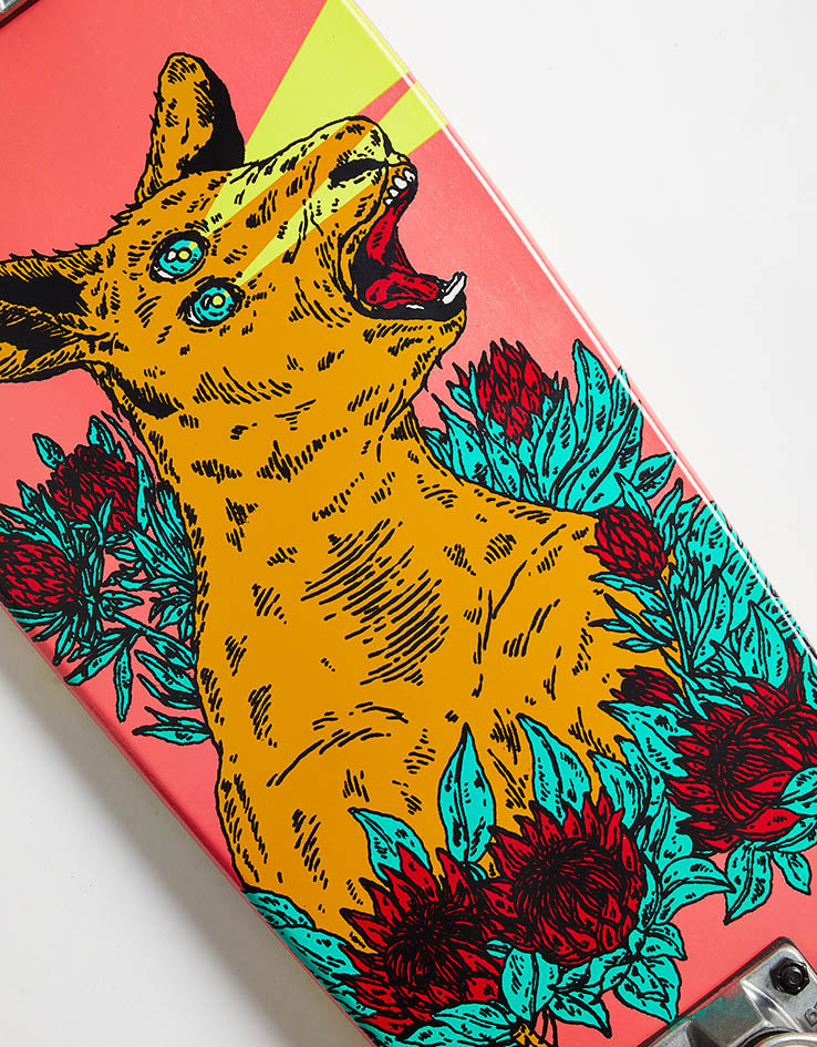 The Globe x Hirotten Blazer Lazer Roo Cruiser Skateboard is a mini diamond-tail cruiser with soft conical wheels that comes fully set up and ready to hit the streets. Coming in at 7.25" wide the deck features art by Hirotton a kangaroo shooting lasers from its eyes in a bed full of roses on a red background. It comes equipped with 4.25" Tensor alloy trucks, 62mm 78a Conical Cruiser Wheels, Abec 7 bearings and Die-cut griptape with top art.