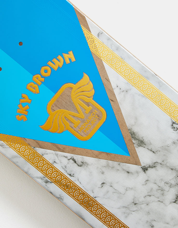 The Monarch Sky Atelier R7 Skateboard Deck is a pro model for Sky Brown coming in at 8.125" wide. The deck features Monarch's classic design with a marble bottom third and blue upper, with Monarch branding in the centre, along with Sky Brown's name.