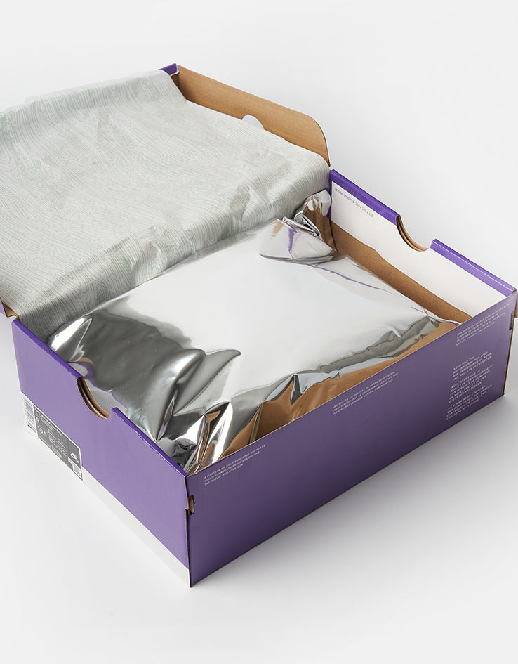 From here the show begins. A black leather Swoosh wraps the silhouette, bordered masterfully with white stitching, whilst the trad - heavy theme begins with barbed wire fencing lining the heel, joined by Old English branding embroidered on the turquoise tongue and heel tabs.  Hayley’s “You Reckon” catchphrase hides on the inner tongue. But as the blind bag hints, all is not as it seems. Step into the sun and this shoe transforms with UV-light-reactive thread, bringing bursts of purple to the Swoosh outline and gothic embroidery, switching up the Dunk in front of your very eyes.