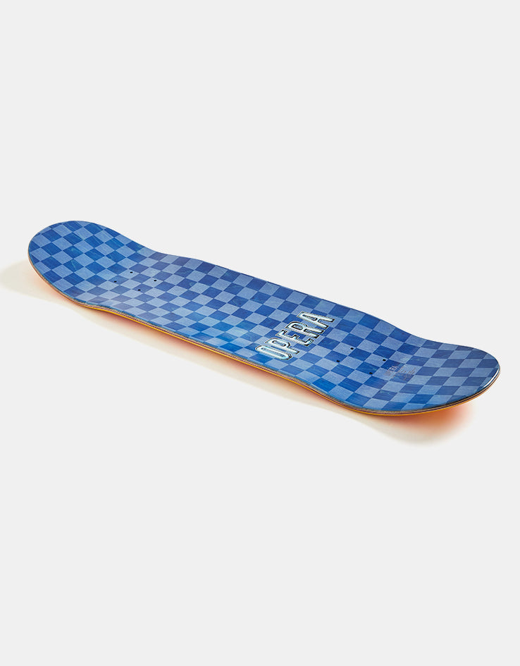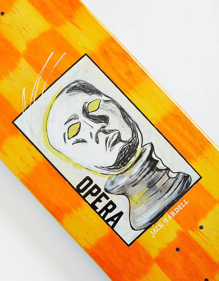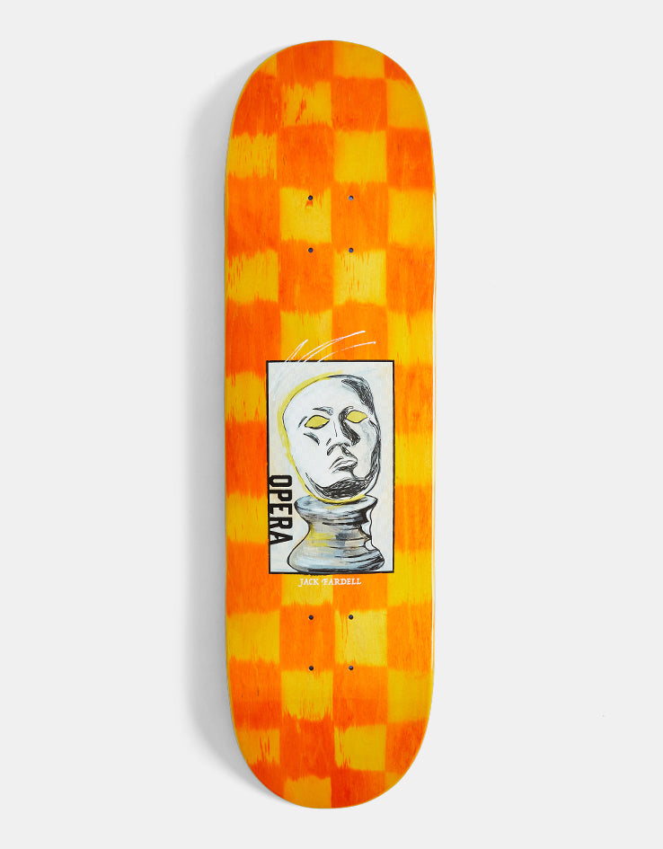 Rising from the ashes of Madness, Bill Weiss has led Opera Skateboards to the upper echelons of the industry with a combination of operatic graphics and expertly crafted hardware. Their Fall '24 Collection satisfies these criteria. The Opera Fardell Pedestal EX7 Skateboard Deck is a pro model for Jack Fardell, coming in at 8.7" wide. The deck features an embossed drawing of a mask sat on a stand in the centre box, alongside Opera branding. The background is a cheque stained dyed veneer.