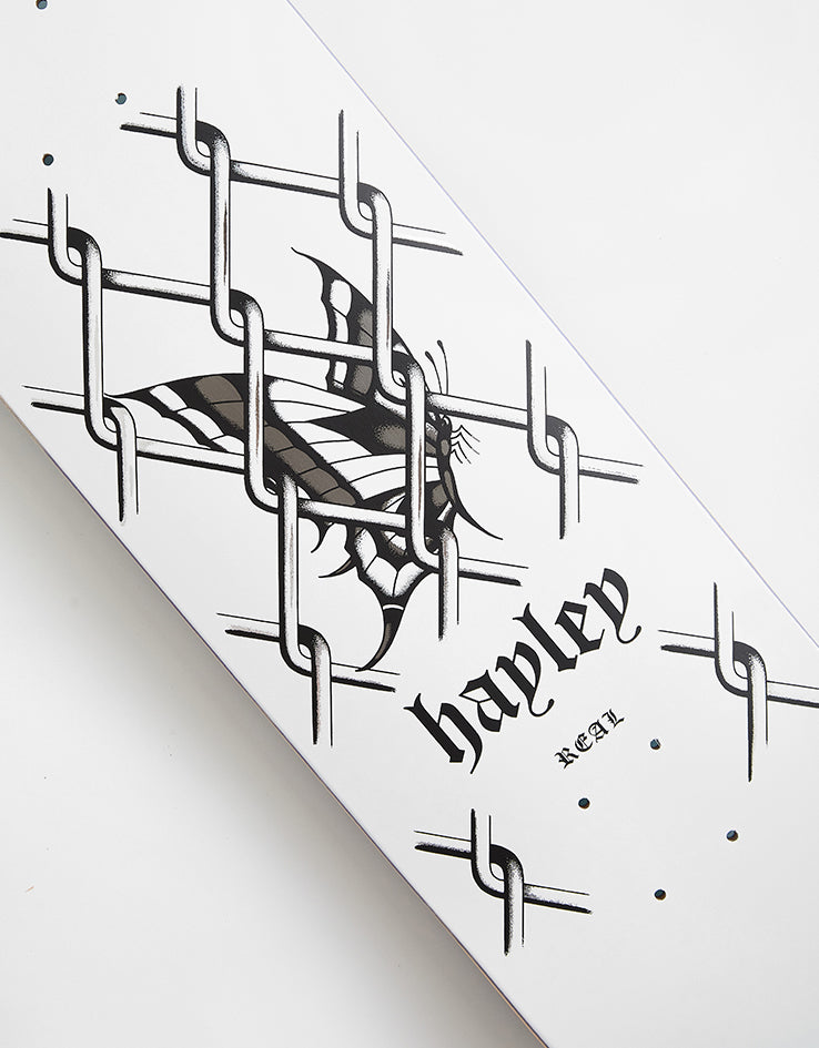 The Real Hayley Outsider Full SE Skateboard Deck is a pro model for Hayley Wilson coming in at 8.25". The deck features a butterfly behind a chain link fence, with Hayley's name and real branding above the bottom bolts on a white background.