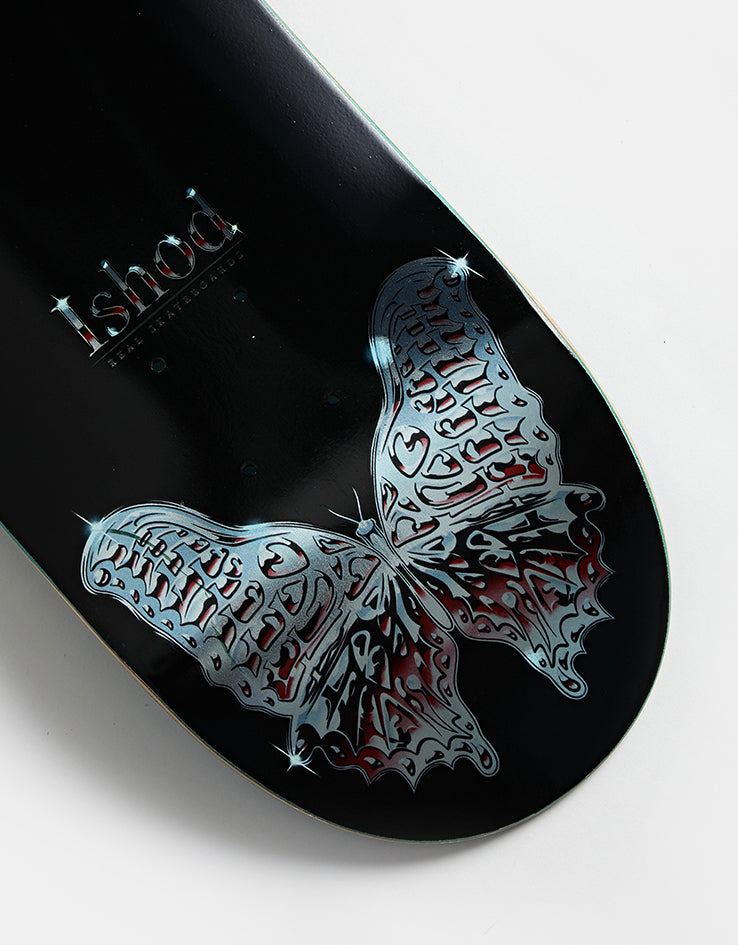 The Real Ishod Mariposa Chrome Redux TWIN TAIL Skateboard Deck comes in at 8.38" wide on a blue background.