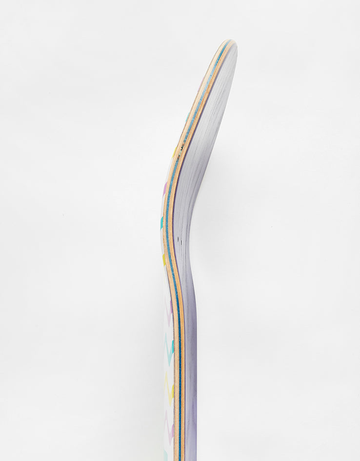 The Roger Doggo Skateboard Deck is a team board coming in at 8.5" wide. The deck features an illustration of a dog in the centre of the board with a colourful zig zag pattern above and below.