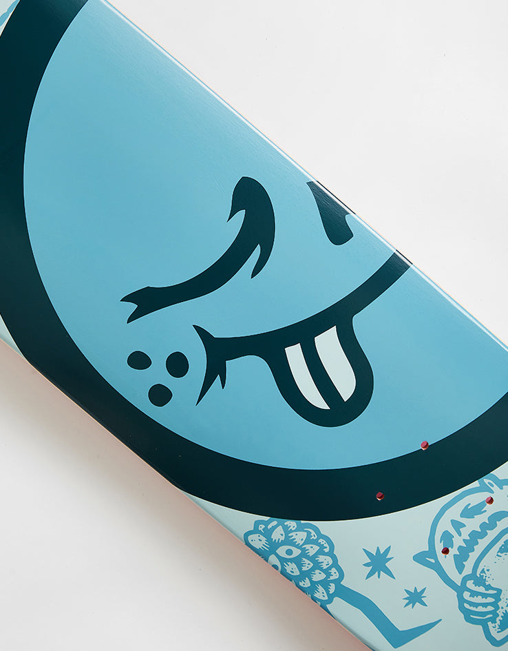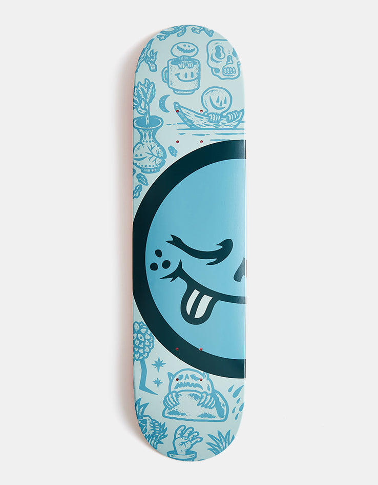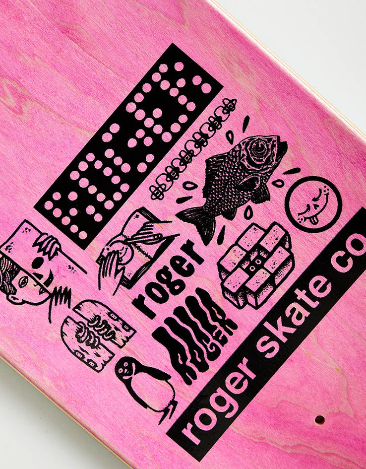 The Roger Half Roger Skateboard Deck is 8" wide and features a emoji style face in the middle of the board with a collection of illustrations faded into the background.
