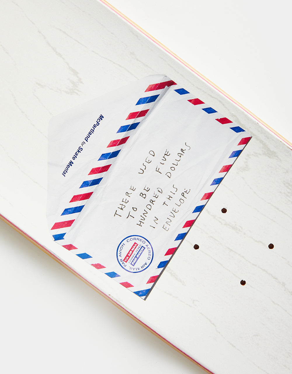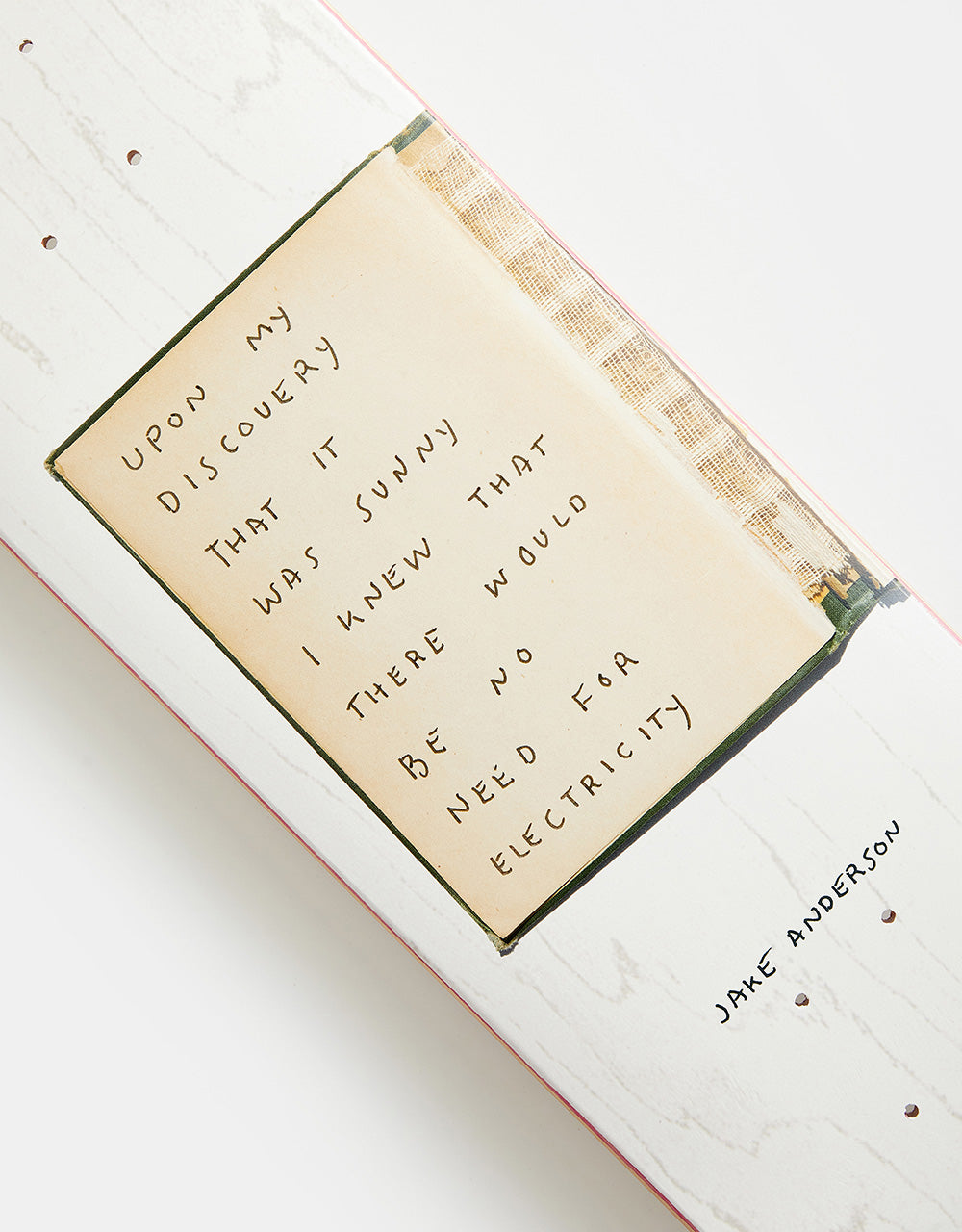 Jake Anderson's McPartland  board is a simple graphic featuring a note pad and poetry in the centre of the deck with a flat, white background.