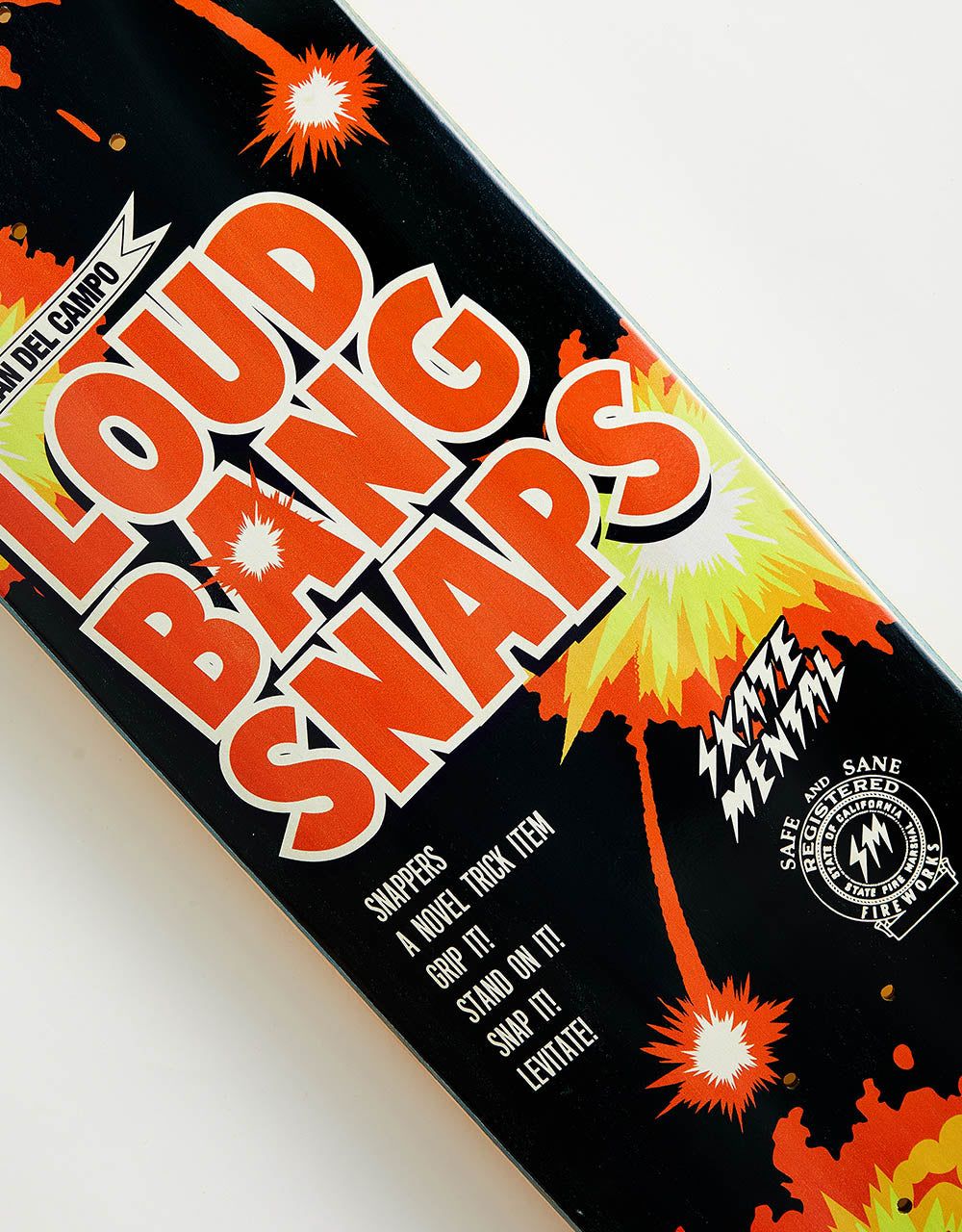 Adrian Del Campo's Snaps deck is a funny board graphic, referring to Adrian's pop and the play on word with fire crackers. Skate Mental branding is featured in the centre of the board towards the rail.