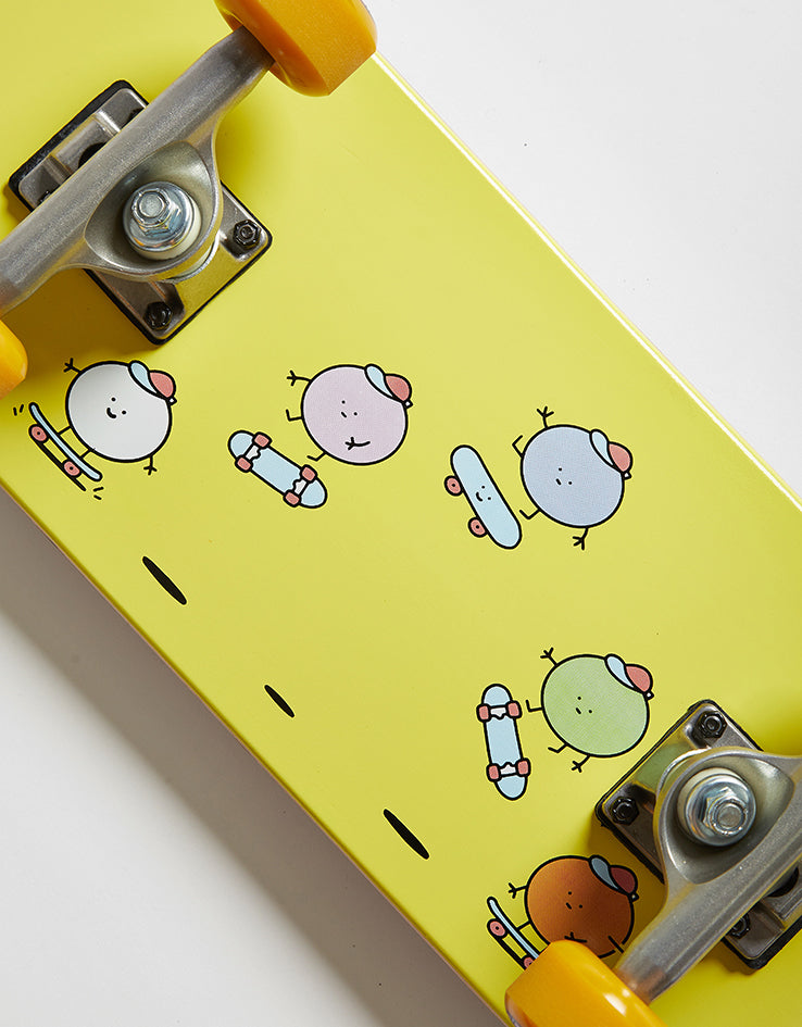 The Tricks BB Kickflip Complete Skateboard comes full set up and ready for skating. Coming in at 7.87" wide, the graphic features a kickflipping character down the length of the board on a pale yellow background. Tricks branding features on the tail. It comes fully equipped with 129mm trucks, 56mm 80A wheels and Abec 7 bearings, making it the perfect board for young or small skaters looking for their first setup.