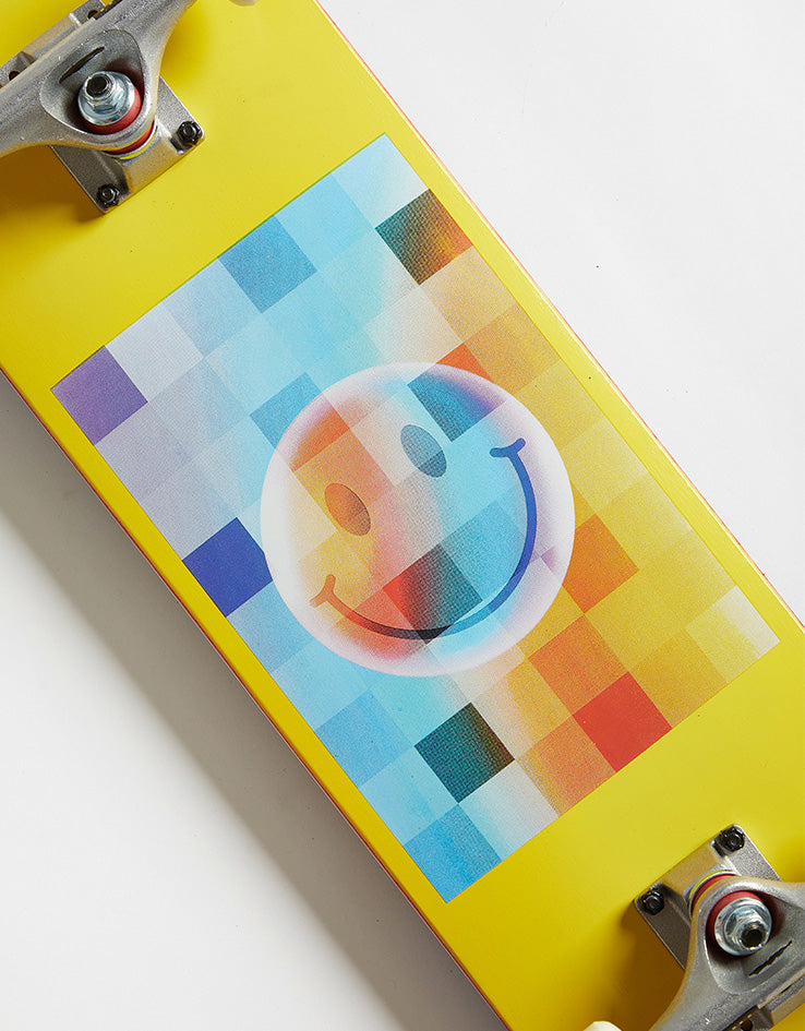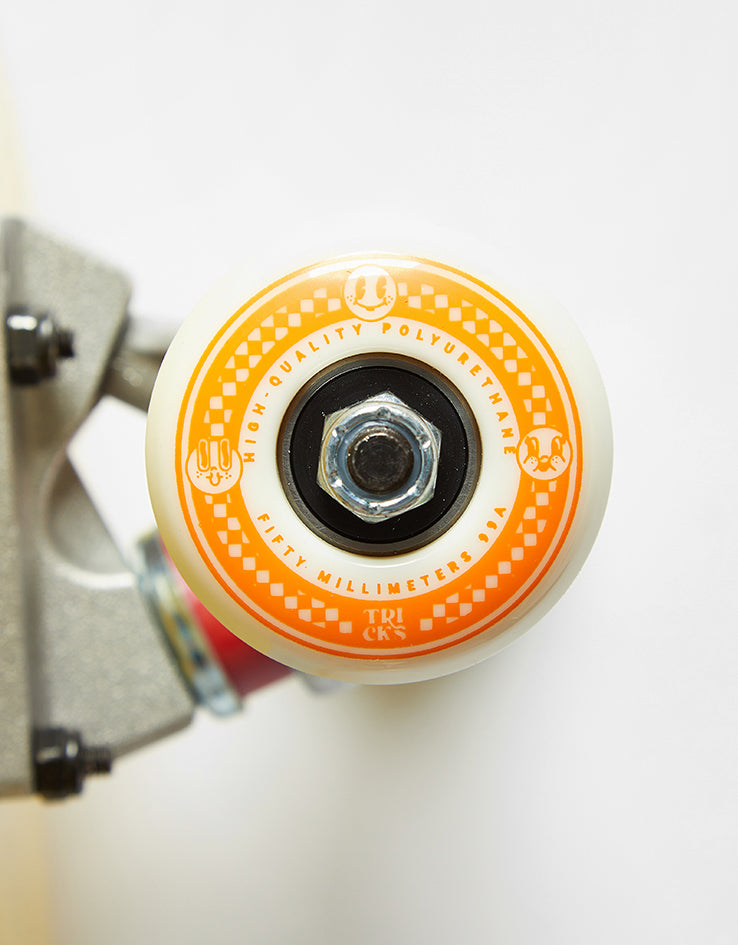 The Tricks Edge Complete Skateboard comes fully set up and ready to skate. The deck features a smiley face on an orange background and comes equipped with raw trucks and 52mm wheels, making it an ideal board for those who are just starting out or looking for an upgrade on their current setup.