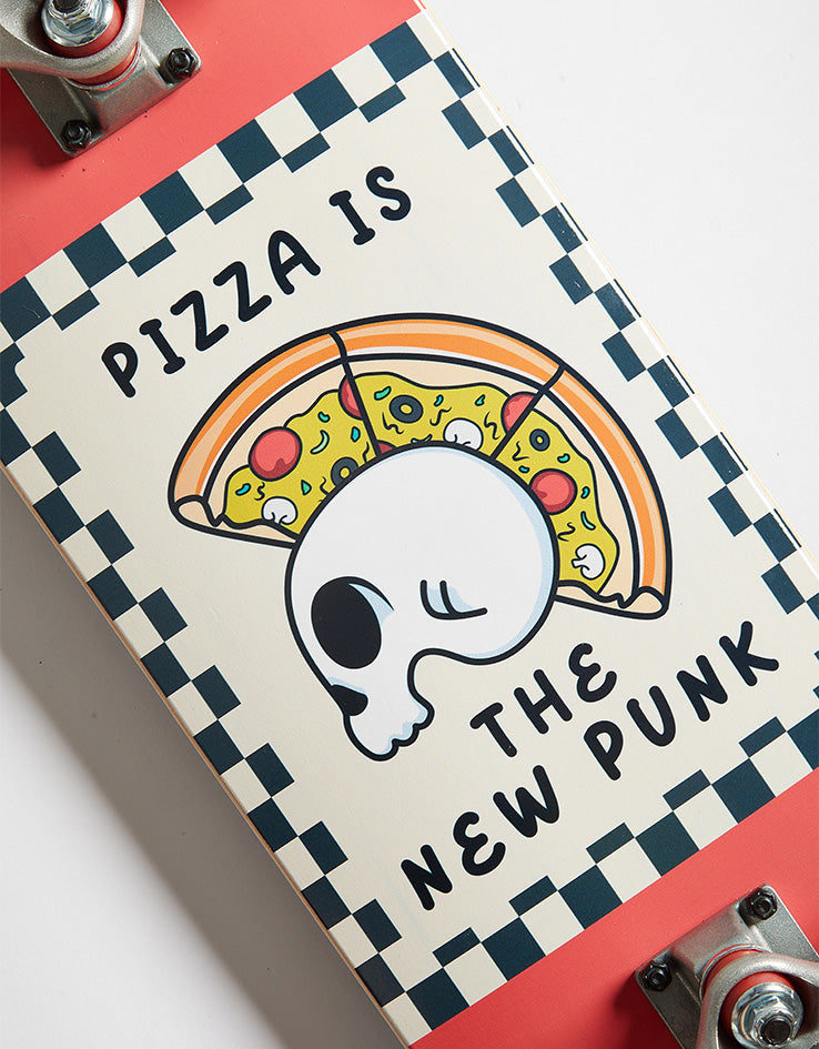 The Tricks New Punk Mid Complete Skateboard comes fully set up and ready to hit the streets. The deck comes in at 8" wide and is a MIDI board, which is perfect for smaller humans. The deck features a skeleton with a pizza mohawk, with the text stating 'Pizza is the New Punk', on top of a red background. It comes equipped with raw trucks and 52mm diameter wheels, making it perfect for those just starting out or any smaller skaters.