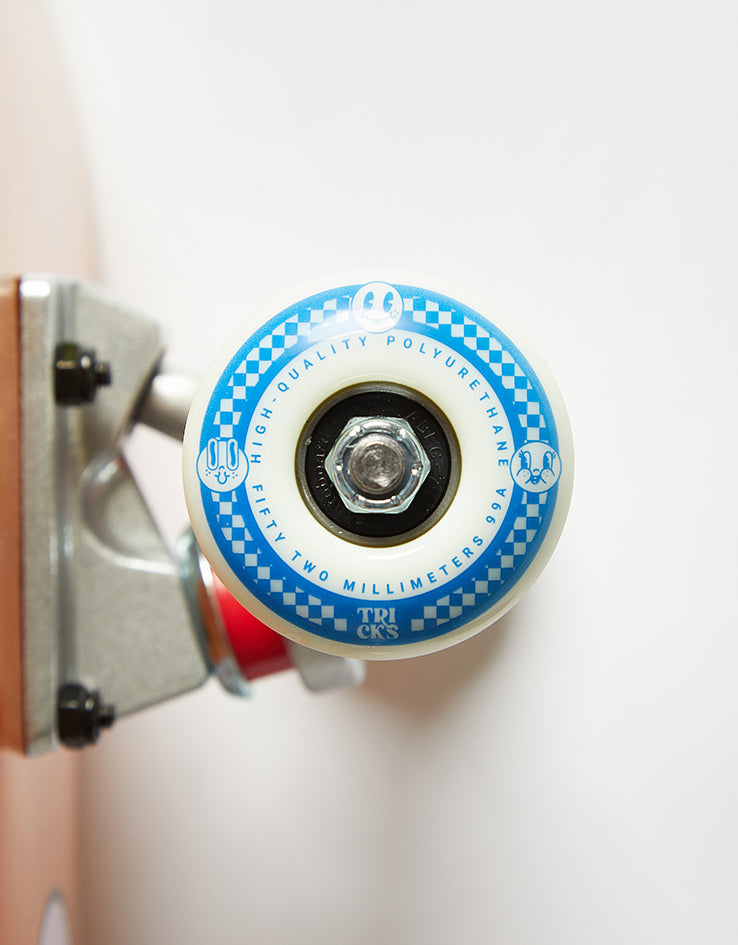 The Tricks Snape Mid Complete Skateboard comes fully set up and ready to skate. The deck features two snakes on an orange background. It is a MIDI board, making it ideal for smaller humans and comes equipped with raw trucks and 52mm wheels.
