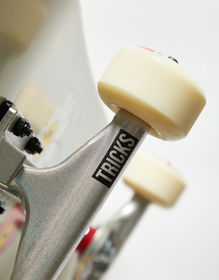 The Tricks Yin Yang Flowers Mini Complete Skateboard comes fully set up and ready to skate. The board features a grip made of non-abrasive cork, allowing barefoot riding. Designed specifically for smaller skaters, the deck is 7.87" wide and features a cute pair of smiling flowers. Coming fully equipped with 129mm TKP Semipolished trucks, 3mm rider pads, 56mm 80A Wheels, and Abec 5 bearings.