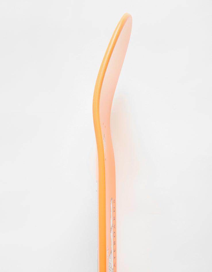 The Welcome Miller Love is Essential on Catblood 2 Skateboard Deck is a pro model for Chris Miller and comes in at 8.75" wide on Welcome's Catblood 2 shape. The deck features a box graphic in the centre with a colourful illustration of a woman sleeping on the grass, on top of an orange background. Welcome branding sits on the bottom border of the inner graphic.